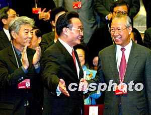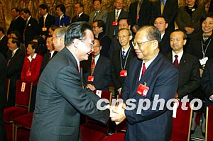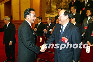 吳邦國(guó)委員長(zhǎng)十八日下午在北京人民大會(huì)堂會(huì)見(jiàn)出席十屆人大一次會(huì)議的港澳代表。圖為吳邦國(guó)與香港代表曾憲梓握手。作者:毛建軍