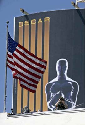 世界電影界年度盛事之一的奧斯卡頒獎(jiǎng)典禮,將于美國西部時(shí)間23日夜(北京時(shí)間24日上午)舉行。時(shí)值伊拉克戰(zhàn)事進(jìn)入白熱化之際,洛杉磯警方已布下重兵,防止恐怖攻擊。圖為奧斯卡典禮會(huì)場(chǎng)頂樓,一名警察在照片右下方的小金人肖像前的制高點(diǎn)進(jìn)行監(jiān)控。(美聯(lián)圖)