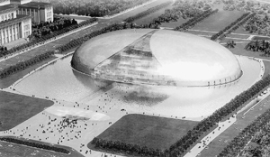 國家大劇院由法國建筑師保羅·安德魯主持設計,設計方為法國巴黎機場公司。國家大劇院建筑屋面呈半橢圓形,由具有柔和的色調和光澤的鈦金屬覆蓋,前后兩側有兩個類似三角形的玻璃幕墻切面,整個建筑漂浮于人造水面之上,行人需從一條80米長的水下通道進入演出大廳,通道兩側被規(guī)劃為藝術博物館、藝術品商場等。大劇院造型新穎、前衛(wèi),構思獨特,是傳統(tǒng)與現(xiàn)代、浪漫與現(xiàn)實的結合。這座“城市中的劇院、劇院中的城市”計劃在2005年以一顆獻給新世紀的超越想象的“湖中明珠”的奇異姿態(tài)出現(xiàn)。