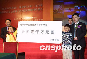 湖南沐林現(xiàn)代食品有限公司董事會(huì)主席伍躍時(shí)30日在北京人民大會(huì)堂通過(guò)中國(guó)光彩事業(yè)促進(jìn)會(huì)、中國(guó)少年先鋒隊(duì)全國(guó)工作委員會(huì)等單位,向中小學(xué)生捐贈(zèng)價(jià)值1000萬(wàn)元人民幣的沐林谷物營(yíng)養(yǎng)早餐,拉開“健康從早做起,健康奔小康”活動(dòng)序幕。作者:趙振清
