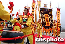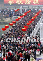 中新社鄭州四月五日電(胡珂張坤)四月五日上午,二00三中國(guó)新鄭“炎黃文化旅游節(jié)”拜祖大典在新鄭市始祖山軒轅廟前隆重舉行。來(lái)自日本、韓國(guó)、馬來(lái)西亞、美國(guó)、香港、臺(tái)灣等十多個(gè)國(guó)家和地區(qū)的華人華僑在這里焚香跪拜,尋根祭祖。
