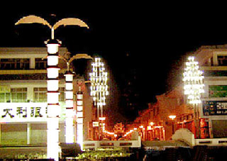 安陽的夜景不同于所看到過的其它城市,它保留著古都特有的部分“原貌”和風俗習慣——古建筑上懸掛著闌珊的紅燈籠、“酒家”懸掛的招牌在微風中飄搖,并不太平整但卻滑亮的石頭鋪就的階梯,通向那在燈光下稍微發(fā)暗的朱紅大門——你會以為這是到了唐或宋朝的哪一家官宅,但是,當你急不可待地推開這吱呀作響的朱門,展現(xiàn)在眼前的卻又是另一番景象:琳瑯滿目的商品擺滿了柜臺,各地的游人正在欣賞、挑揀著一個個精美的紀念品。