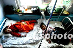 “三一九”豆奶事件后二十天,五歲的史雨平(右)與六歲的王秀文仍在海城市中心醫(yī)院打點滴。當?shù)卣Q,自3月19日當?shù)?所小學學生飲用豆奶以來,先后已有2500多名學生出現(xiàn)了腹痛、頭暈、惡心等不良反應。作者:鄭萍萍