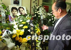 “這可能是五十年代末六十年代初媽媽演《花為媒》時(shí)期的合影。是他們生前最喜歡的合影之一!眳抢系膼(ài)女吳霜說(shuō)。客廳的四壁還掛著很多新鳳霞各個(gè)時(shí)期的生活照和劇照以及兩老的合影。劉延?xùn)|、胡德平、張鍥、李默然等人和文化部等單位都送來(lái)了花籃。很多客廳里擺不下的花籃只好擺到樓道里。吳霜說(shuō):“劉延?xùn)|部長(zhǎng)昨天勉勵(lì)我們說(shuō),你們的父母是杰出的藝術(shù)家,你們要繼承他們的事業(yè),要像他們那樣做光明磊落的人!薄白蛱靵(lái)的人可太多了,很多都是七八十歲的老人,如丁聰、黃苗子夫婦等,有些走路都要?jiǎng)e人攙著,來(lái)到靈前痛哭流涕。老爺子為人好,朋友多!眳羌业暮糜褟埵⒋夯貞浾f(shuō),昨天來(lái)的最高壽的就是黃苗子他老人家,今年九十了。