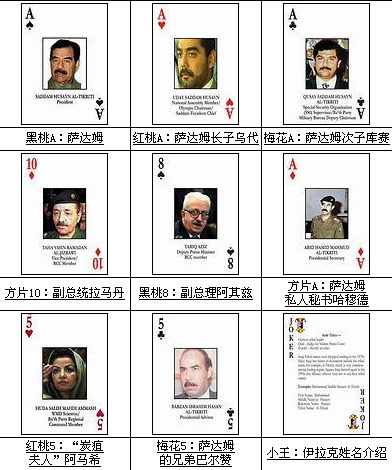 中新網(wǎng)4月12日電 據(jù)法新社報(bào)道,美國(guó)國(guó)務(wù)院當(dāng)?shù)貢r(shí)間周五發(fā)出了撲克牌形式的伊拉克高官“通緝令”。媒體報(bào)道稱撲克牌共有55張,其中52人為伊拉克官員名單,另外的3張為伊拉克人姓名等相關(guān)問(wèn)題介紹。這些高官按撲克牌的次序依次列出,其中薩達(dá)姆與他的兩個(gè)兒子分別被定為黑桃、梅花和紅心A。方片A為薩達(dá)姆私人秘書哈穆德。據(jù)悉,撲克牌“通緝令”已經(jīng)發(fā)到美軍官兵手中。