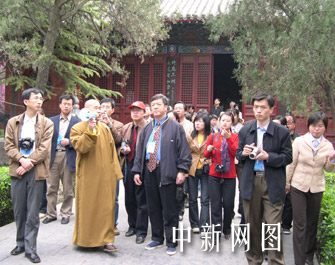 洛陽白馬寺和尚為網(wǎng)絡媒體記者當“導游”。玉樹 攝