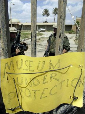 美英聯(lián)軍攻入伊拉克首都巴格達(dá)后,陷入嚴(yán)重混亂之中。伊拉克國(guó)家博物館遭到大肆洗劫,大量幾千年前的珍貴文物遭到破壞和掠奪。圖為美國(guó)海軍陸戰(zhàn)隊(duì)士兵在伊拉克國(guó)家博特館守衛(wèi)。
