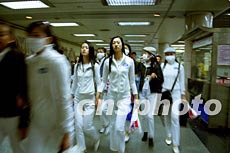 幾名上海國際汽車展的車模小姐二十四日在上海地鐵匆匆而行。為了控制“非典”在滬蔓延,上海國際汽車展今日提前閉幕。作者:劉殊瑾
