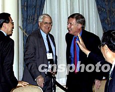 應美國百人會第十二屆年會邀請,兩位美國前駐華大使芮孝儉(左二)和羅德(右二)二十五日在紐約百人會年會專題討論會上發(fā)表演講,兩人均稱目前美中關系發(fā)展良好,臺灣問題仍是美中關系的核心問題。作者:趙海燕
