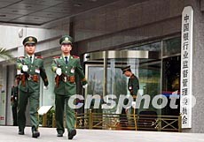 中國(guó)銀行業(yè)監(jiān)督管理委員會(huì)二十八日正式掛牌。銀監(jiān)會(huì)將行使原由中國(guó)人民銀行履行的監(jiān)督管理職權(quán)。圖為武警戰(zhàn)士在銀監(jiān)會(huì)門前執(zhí)勤。作者:毛建軍