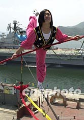“高空飛燕”王海燕二十八日在深圳明思克航母熱身。她將在航母海空之間高六十米、長二百多米、直徑二十一點五毫米的鋼索上生存三十一天。作者:陳文