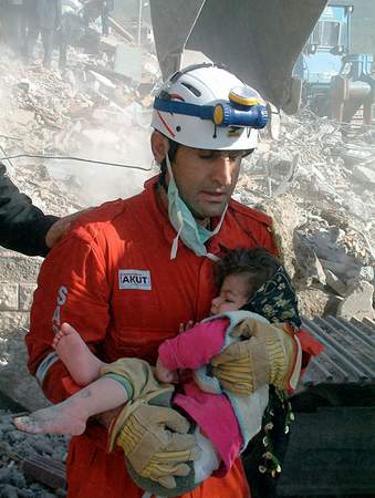 省長透露說,到他接受采訪時止,總共有55名孩子被救援人員從瓦礫中救了出來。在土耳其國家電視臺TRT播出的畫面上能看到:一名士兵抱著一個小男孩從瓦礫堆里走出來,四周的人們一片歡呼,電視上能清晰聽到那個小男孩在呼叫:“爸爸!爸爸!”