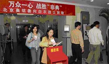 北京奧運會的申辦和籌辦工作,一直得到全國人民的大力支持。此時此刻,向戰(zhàn)斗在一線的醫(yī)務(wù)工作者奉獻(xiàn)愛心,是我們向社會應(yīng)做的回報。我們相信,在以胡錦濤同志為總書記的黨中央堅強(qiáng)領(lǐng)導(dǎo)下,在廣大醫(yī)務(wù)工作者的辛勤努力下,全國人民團(tuán)結(jié)一心,眾志成城,我們一定能夠依靠科學(xué)的力量和集體的智慧,打贏非典型肺炎防治工作的攻堅戰(zhàn),奪取最后的勝利。