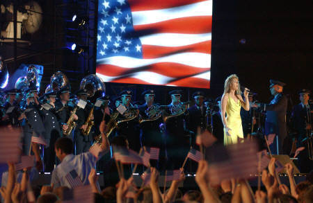 美國空軍預(yù)備軍官樂隊(duì)在哥倫比亞公司在2日錄制的特別節(jié)目“搖滾美國——向美軍致敬”中,登上杜魯門號(hào)航空母艦與獲葛萊美獎(jiǎng)的女歌手席琳狄翁一起表演“天佑美國”。(路透)