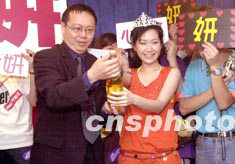 歌星關(guān)心妍5月14日在香港尖東Neway卡拉OK舉行的新歌祝捷會(huì)上,與唱片公司高層齊開(kāi)香檳,慶祝其新歌《優(yōu)先訂座》在香港三大中文電臺(tái)于上周的播放率均名列三甲。中新社傳真 鄧慶樂(lè) 攝