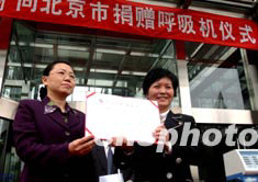 十五日,中國航天科工集團公司向北京市政府捐贈五臺抗“非典”治療呼吸機,用于北京的抗非典工作。圖為中國航天科工集團公司副總經(jīng)理薛利(右)與北京市民政部門代表在捐贈儀式上。中新社記者:武仲林