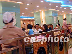 世界衛(wèi)生組織解除了對(duì)香港發(fā)出的旅游警告,使一度沉寂的酒樓食肆霎時(shí)熱鬧起來(lái).圖為市民在周末除下口罩享受美味佳肴.中新社傳真 洪少葵 攝