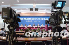 五月二十七日上午九時,海峽兩岸防治SARS視訊會在北京、臺北、廣州、香港四地同時舉行。近五十名與會專家就SARS病人的臨床診斷、流行病特征、治療方法等問題交換了意見。中新社記者:張煒