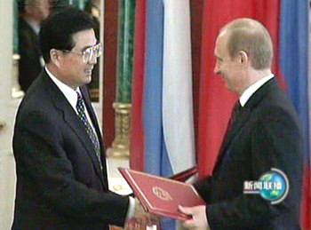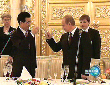 胡錦濤說,在剛剛與普京總統(tǒng)進行的親切友好的會談中,雙方就兩國關(guān)系和共同關(guān)心的地區(qū)和國際問題深入交換了意見,達成了廣泛共識。雙方都表示,要承前啟后,繼往開來,在中俄關(guān)系已經(jīng)取得的成果的基礎(chǔ)上,進一步加深兩國的睦鄰友好,不斷擴大兩國在各個領(lǐng)域的合作,努力開創(chuàng)中俄戰(zhàn)略協(xié)作伙伴關(guān)系的新局面。