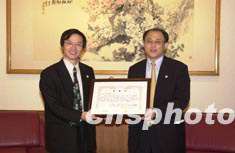 日本中華總商會28日捐資六百五十萬日元,支持中國抗擊非典型肺炎。圖為在捐款儀式上,中國駐日使館總領(lǐng)事張立國向總商會會長顏安(左)頒發(fā)感謝狀。中新社記者:陶光雄