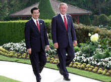 正在法國(guó)埃維昂參加南北領(lǐng)導(dǎo)人非正式對(duì)話會(huì)議的中國(guó)國(guó)家主席胡錦濤當(dāng)?shù)貢r(shí)間一日下午在埃維昂皇家飯店會(huì)見了美國(guó)總統(tǒng)布什。圖為兩位領(lǐng)導(dǎo)人在飯店花園接見記者。作者:陳波