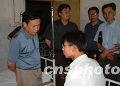 廣東省始興中學(xué)六月一日發(fā)生學(xué)生集體食物中毒意外,有五十五名中學(xué)生因食用不潔食品引起細(xì)菌性食物中毒。到六月二日下午,仍有十五人需留院觀察治療,但已確定無(wú)生命危險(xiǎn)指征。圖為中共始興縣委書記馮壽宗在醫(yī)院病房看望中毒學(xué)生。作者:馮昶