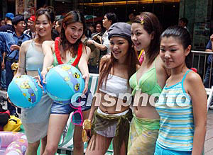 為刺激消費(fèi)市道和營(yíng)造復(fù)蘇氣氛,香港從六月八日起在灣仔駱克道舉行星光之夜活動(dòng)。圖為數(shù)十名模特穿上泳裝在街頭巡游。潘索菲 攝