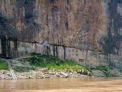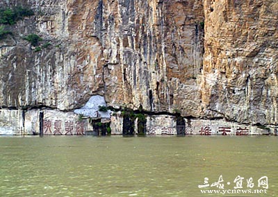 “夔門自古天下雄”。作為三峽門戶的夔門,長(zhǎng)江在這里驟然變窄,巍峨高聳的赤甲山,絕壁千仞的白鹽山,共同夾出了以雄著稱的夔門,峽口處江面寬不到百米,最窄處僅50米。在白鹽山千仞絕壁上,從宋代至民國(guó)初年歷代詩仙詞圣留下了十余幅石壁題刻,總面積為500余平方米,大體在海拔115至119米之間。三峽蓄水后,摩崖石刻也就永遠(yuǎn)的消逝了。跑了一輩子川江的老船長(zhǎng)羅獻(xiàn)銀老人就住在這里。