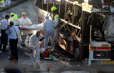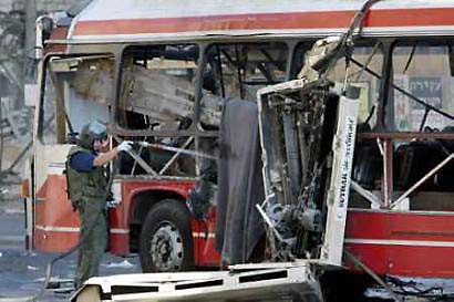 就在爆炸現(xiàn)場附近一家鞋店當服務(wù)員的哈吉德·斯泰恩渾身顫抖著哭著告訴記者說:“爆炸發(fā)生時,我剛剛從14路公共汽車上下來。我一下子就被炸蒙了,根本不知道躲往哪躲,藏往哪藏!我簡直不敢相信自己會有這么幸運!”劇烈的爆炸炸飛了這輛紅白相間的14路公共汽車的所有車窗,車的左側(cè)被炸出一個大洞,車頂被整個兒掀開。