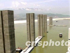 三峽船閘導(dǎo)航堤浮船箱,由武警水電二總隊(duì)三峽工程指揮所承建,每艘浮箱長五十五米,寬九點(diǎn)四米,重一千八百噸,由于是空心可隨水位變化而升降,該浮箱吃水三點(diǎn)五米,最厚部位僅零點(diǎn)五五米,最薄部位零點(diǎn)一五米。在三峽工程永久船閘上游引航道組成南北兩側(cè)長堤,用做船舶過船閘時(shí)臨時(shí)?恐。