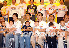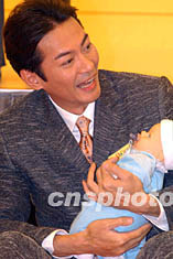 香港藝員江華,六月十五日在香港時(shí)代廣場(chǎng)舉行的歡度父親節(jié)活動(dòng)上,風(fēng)趣示范抱BB做運(yùn)動(dòng)一分鍾。錢(qián)興強(qiáng) 攝