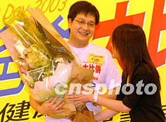 為歡度一年一度的父親節(jié),香港時(shí)代廣場(chǎng)六月十五日舉行“做個(gè)健康爸爸努力保護(hù)頭家”活動(dòng),圖為一位患“非典”家屬向醫(yī)生獻(xiàn)上鮮花致意。錢(qián)興強(qiáng) 攝