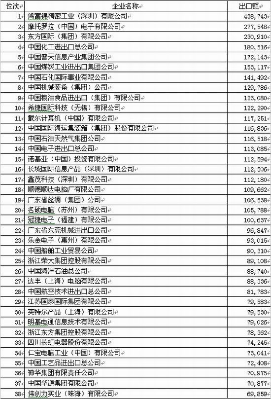 鴻富錦精密工業(yè)(深圳)有限公司出口額達43.9億美元,增長115.9%,列200家之首;摩托羅拉(中國)電子有限公司出口27.8億美元,增長72.1%,排名由上年的第7位上升到第2位。鴻富錦精密工業(yè)(深圳)有限公司和摩托羅拉(中國)電子有限公司還分別以進出口79.2億美元和53.9億美元列進出口額最大的500家企業(yè)的第2和第4位。