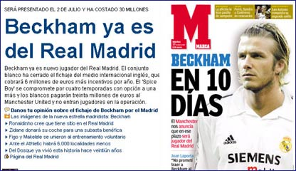 皇馬俱樂部消息人士透露,貝克漢姆7月1日將會出現(xiàn)在馬德里,而7月2日即可為俱樂部上場比賽。