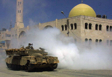 6月17日,在約旦河西岸納布盧斯附近的阿斯卡爾難民營里,一輛以色列坦克在一座清真寺前駛過。在當(dāng)天這一地區(qū)發(fā)生的巴以沖突中,以色列軍隊開槍打傷兩名巴勒斯坦人。