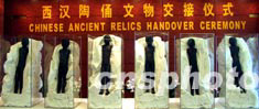 十七日下午,美國(guó)國(guó)土安全部移民與海關(guān)執(zhí)法局的官員將六件西漢陶俑交送到中國(guó)駐紐約總領(lǐng)館,這六件神態(tài)各異的陶俑來自二00一年被盜的中國(guó)陜西西安西漢竇皇后墓,經(jīng)過中美兩國(guó)執(zhí)法部門一年多的合作終于在十七日歸還中國(guó)政府。