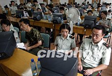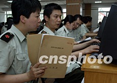 解放軍小湯山醫(yī)院的所有SARS康復(fù)患者將在20日出院。18日,院方緊急征調(diào)正在隔離區(qū)休整的年輕醫(yī)護(hù)人員冒著高溫酷暑向北京SARS數(shù)據(jù)庫(kù)輸入收治的六百多名患者資料。中新社記者:任晨鳴