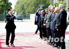 國(guó)務(wù)院總理溫家寶二十三日在北京向印度總理瓦杰帕伊的隨行官員揮手致意。中新社記者:鄭萍萍