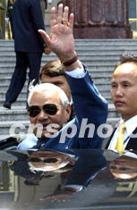 印度總理瓦杰帕伊二十三日上午在北京人民大會堂與中國總理溫家寶舉行會談,并出席簽字儀式。圖為瓦杰帕伊走出人民大會堂時揮手示意,顯示對此次訪華充滿信心。中新社記者:毛建軍