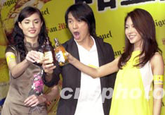 影星周星馳6月23日在香港出席全新生力電視廣告「(口加甘)至系新鮮─放狗篇」首播記者會(huì),他與廣告片中的兩位女角Mandy(左)和Race(右)在會(huì)上碰杯。中新社記者 鄧慶樂(lè)