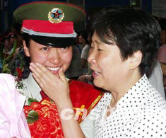 六月二十四日,完成北京小湯山戰(zhàn)地醫(yī)院抗擊非典任務(wù)的蘭州軍區(qū)白衣戰(zhàn)士凱旋。在蘭州車站,一位母親為女兒擦去激動(dòng)的淚水。 作者:楊曉波