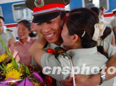 完成北京小湯山戰(zhàn)地醫(yī)院抗擊“非典”任務(wù)的蘭州軍區(qū)白衣戰(zhàn)士二十四日順利回到蘭州。在蘭州車站,一名軍醫(yī)與家人久別重逢,不禁熱淚盈眶。作者:杜洋