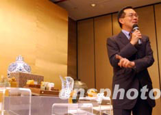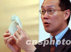 香港佳士得2003年春季拍賣會之《中國宮廷御制藝術精品》因受SARS影響延遲至7月7日舉行,亞洲區(qū)主席林華田6月26日介紹一套珍貴的清朝康熙御用田黃玉石印章,估價成交逾二千萬港元。中新社記者 洪少葵