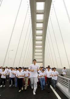 中新網(wǎng)6月28日電 世界上跨度最大的鋼拱橋——上海盧浦大橋,二十八日上午正式建成通車,小巨人姚明帶領(lǐng)千名中外長(zhǎng)跑愛(ài)好者參加了主題為“活力上海,奔向未來(lái)”跨橋長(zhǎng)跑活動(dòng)。