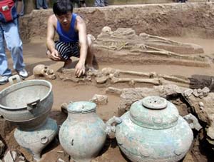 在發(fā)掘現(xiàn)場可以看到,遺址東南部寬7.3米、長9米以上的墓坑內,3具長1.6米左右的尸骨頭朝南方,整齊地擺放在墓坑中央,臉部全部向東。陳祖軍告訴記者:“這些尸體的左臂卷曲在胸前,右手都是處于非正常狀態(tài),有的是小臂和大臂緊緊地貼在一起,有的肘關節(jié)已經錯位,所以這3具尸骨很可能是殉葬或者祭祀的犧牲品。在祭祀品下面可以隱約看見板狀的東西,可能是棺材。在厚約30厘米的土層下,可能埋有墓葬的主人。從出土器物的規(guī)格和數量來看,肯定墓葬主人是巴國的一位王侯。”