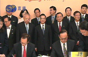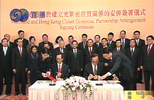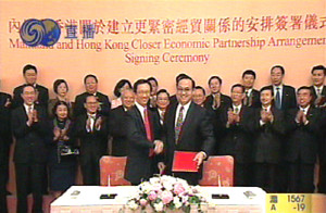 六月十六日,香港特首董建華在正式宣布CEPA月底簽署的消息時(shí)這樣說(shuō)∶“在國(guó)家主席胡錦濤、總理溫家寶及副總理吳儀的關(guān)心下,香港與內(nèi)地更緊密經(jīng)貿(mào)關(guān)系安排的磋商,已取得重大的實(shí)質(zhì)性進(jìn)展,雙方已經(jīng)極接近一致意見(jiàn),并商定於六月三十日在香港舉行簽署儀式。”