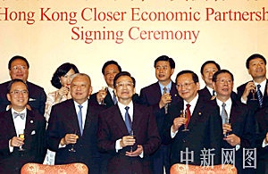 六月二十九日,在國(guó)務(wù)院總理溫家寶的見證下,商務(wù)部副部長(zhǎng)安民及香港特別行政區(qū)財(cái)政司長(zhǎng)梁錦松分別代表中央及香港在香港禮賓府簽署“香港與內(nèi)地更緊密經(jīng)貿(mào)關(guān)系安排”。中新社記者 潘索菲 攝