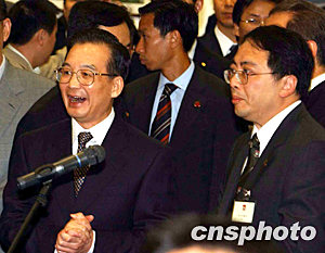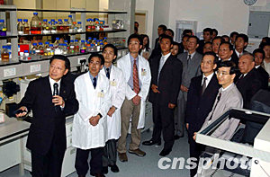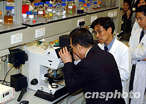 六月三十日,國(guó)務(wù)院總理溫家寶參觀香港大學(xué)基因中心,并聆聽教授介紹,如何首先找到SARS冠狀病毒。中新社記者 潘索菲 攝