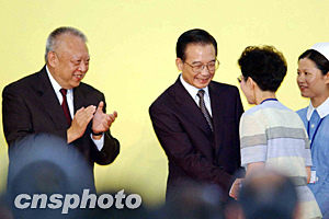 國務(wù)院總理溫家寶6月30日出席表揚(yáng)醫(yī)護(hù)人員成功抗炎大會,向在抗擊SARS中以身殉職的醫(yī)護(hù)人員家屬表示慰問。洪少葵 攝