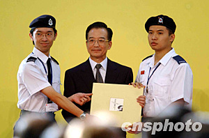 國務(wù)院總理溫家寶6月30日香港表揚(yáng)醫(yī)護(hù)人員成功克服SARS聚會上,接受香港學(xué)生贈送紀(jì)念品。洪少葵 攝